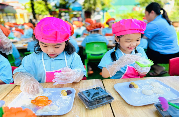 Tiếp nối chương trình là hoạt động trải nghiệm “Bé làm bánh dẻo Trung thu”, được các bé vô cùng yêu thích. Trong không khí vui tươi, từng nhóm nhỏ hào hứng cùng cô giáo nặn bánh. Những chiếc bánh dẻo xinh xinh với nhiều hình thù ngộ nghĩnh, chứa đựng biết bao tình cảm, sự hứng khởi và tự hào của các bé khi được tự tay làm nên sản phẩm của mình. Hoạt động làm bánh không chỉ giúp trẻ rèn luyện sự khéo léo, kiên nhẫn, khả năng làm việc nhóm, mà còn nuôi dưỡng tình yêu đối với ẩm thực truyền thống Việt Nam. Mỗi chiếc bánh là một câu chuyện nhỏ về sự sẻ chia, về niềm vui sáng tạo và niềm tự hào văn hóa dân tộc.